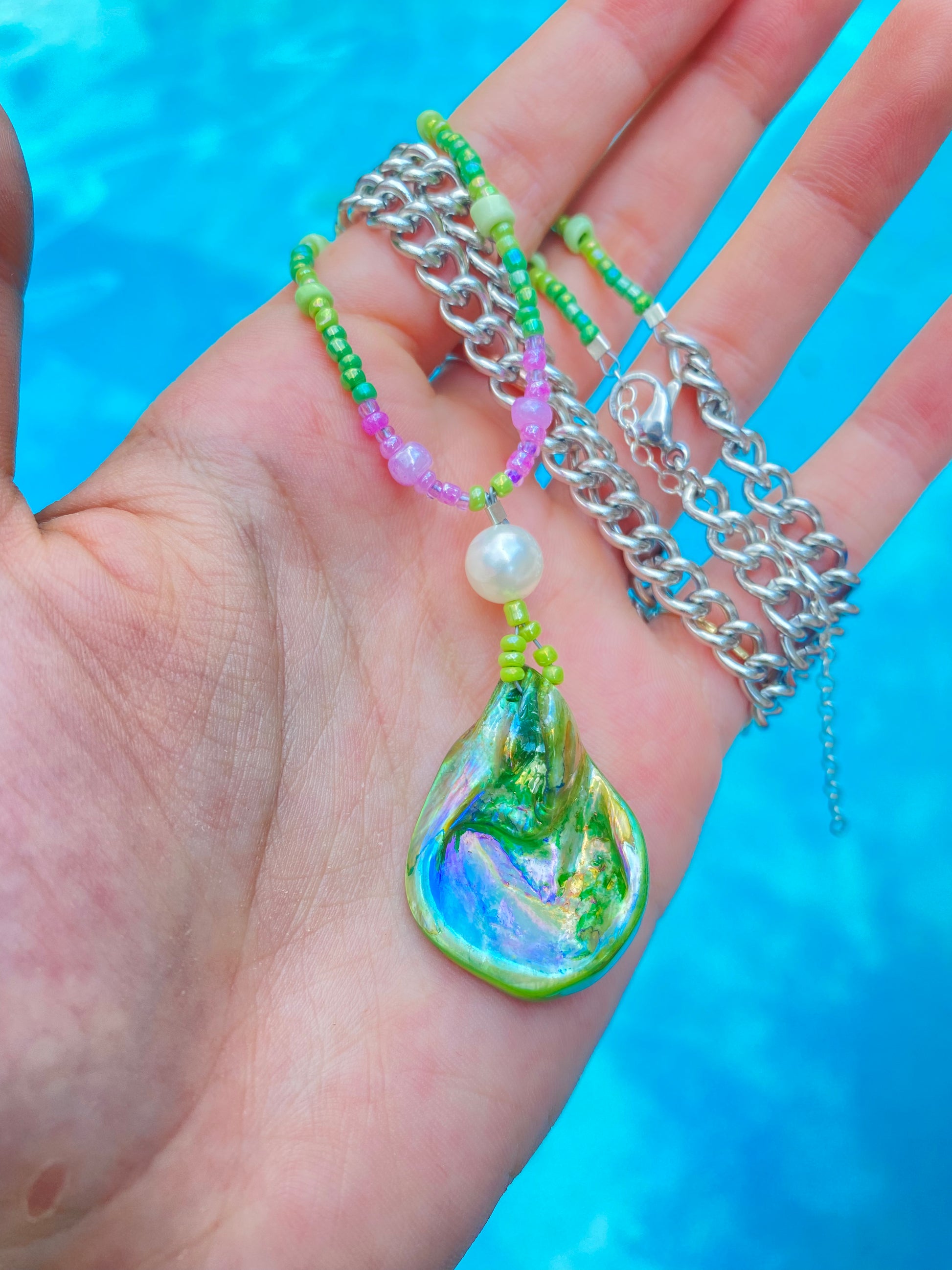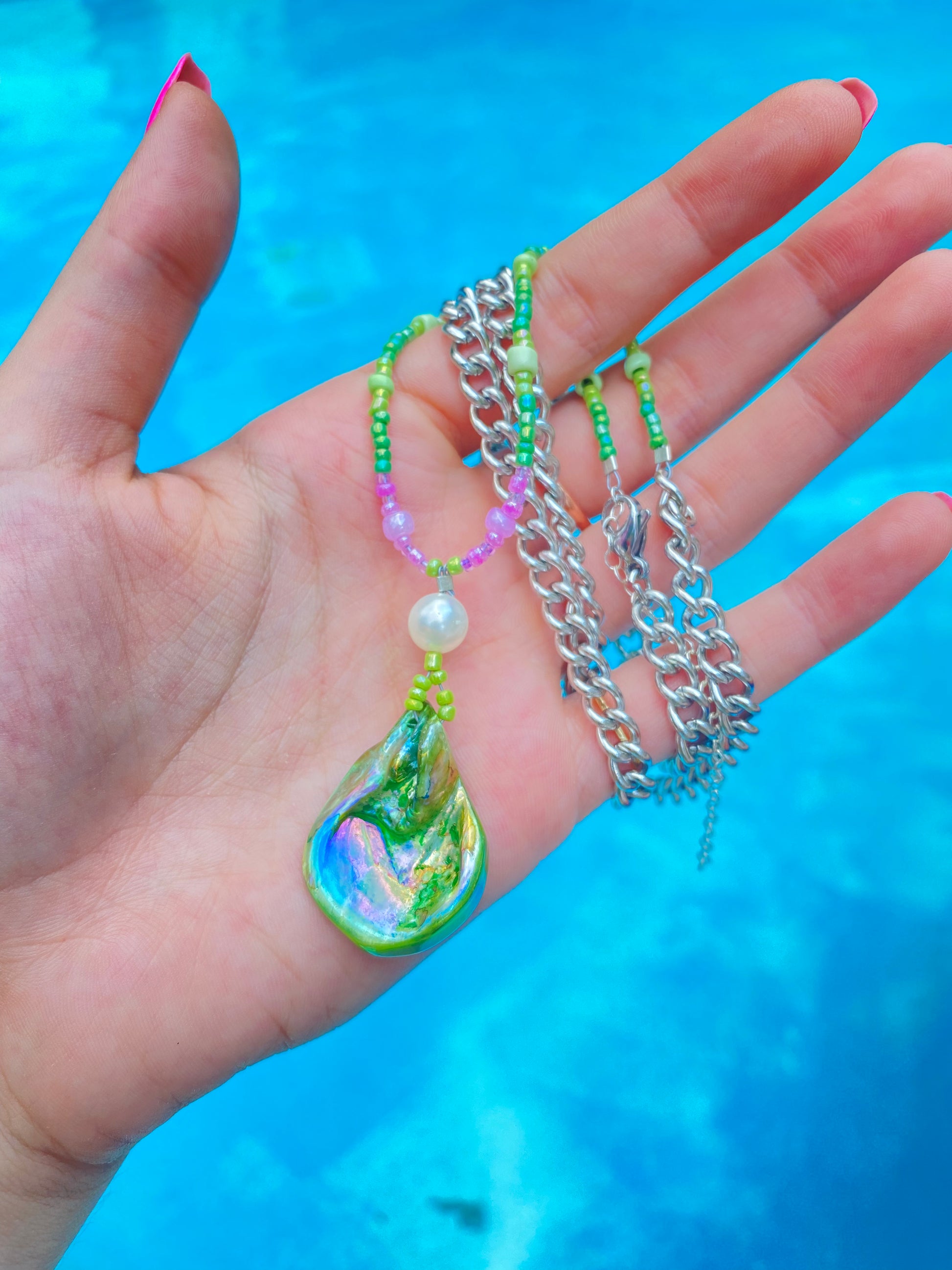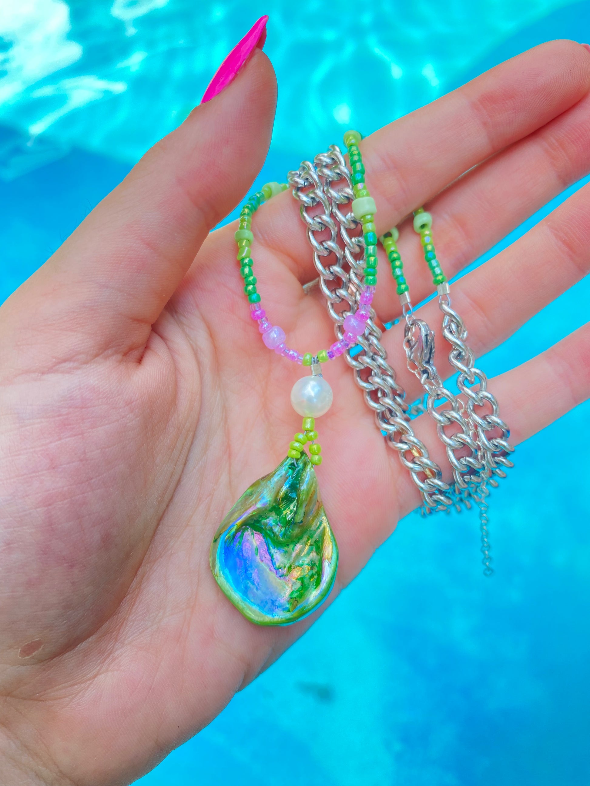 Materials: Stainless Steel Chain, Shells, Freshwater Pearl, Glass Beads