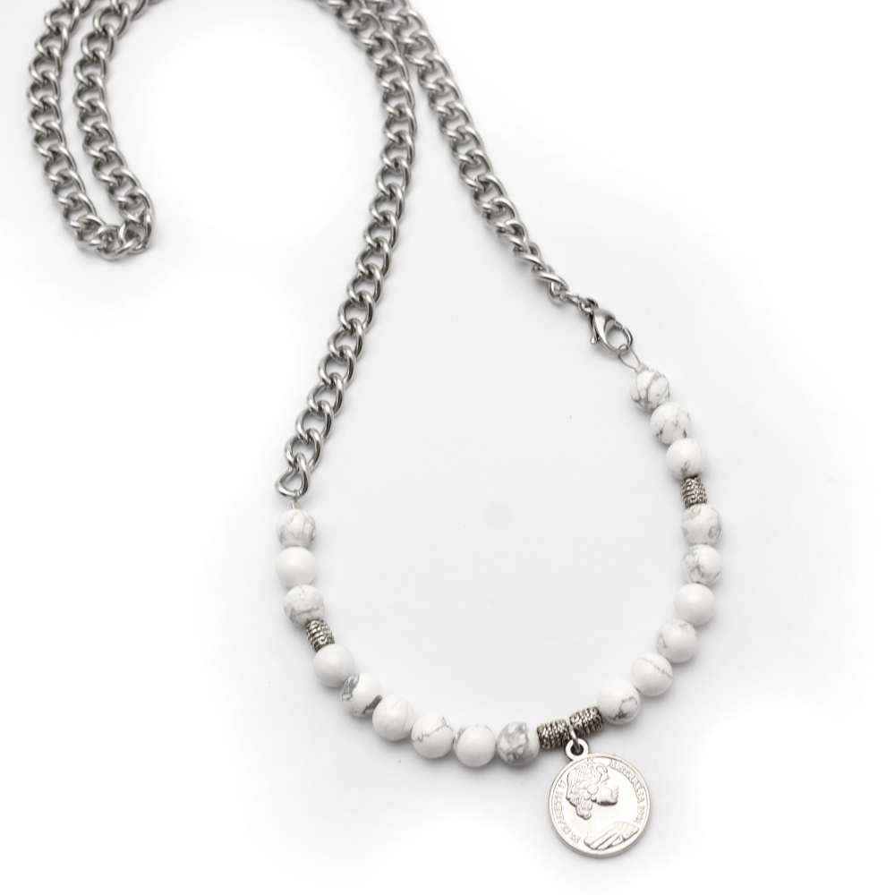 -White Howlite beads with a coin charm